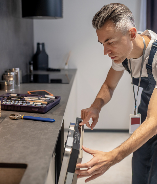 The image shows a skilled technician carefully inspecting and repairing a kitchen appliance. Professional home appliance repair services help ensure that household devices continue to function efficiently and safely. Appliances such as dishwashers, ovens, refrigerators, and washing machines are essential for daily household tasks, and proper servicing helps maintain their performance.Experienced technicians use specialized tools and technical knowledge to diagnose problems and fix faulty components.